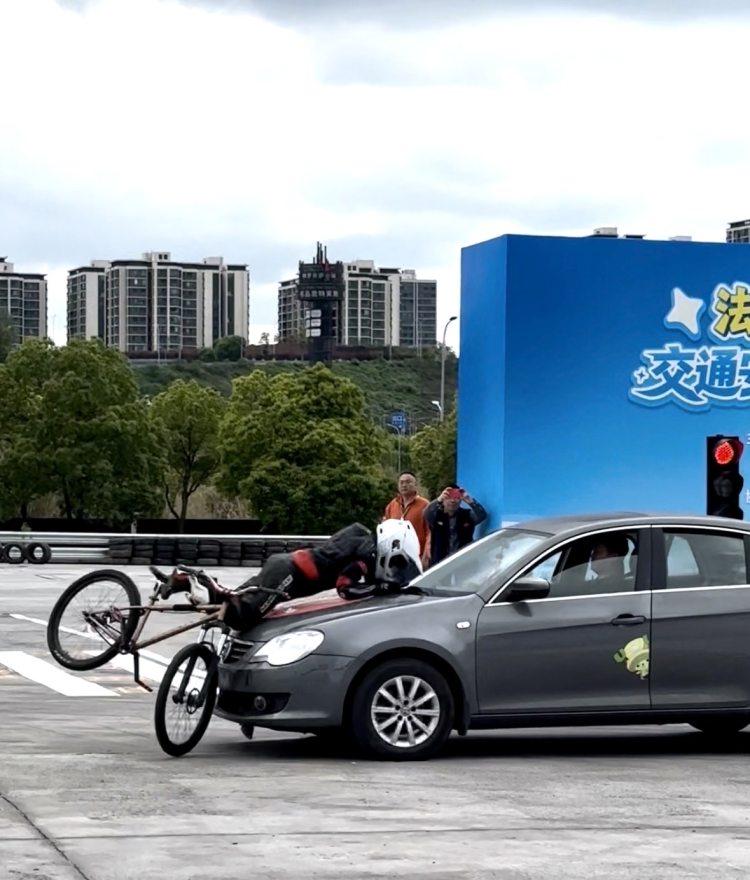 在实景表演环节,特技演员现场还原“开门杀”、非机动车闯红灯、逆行、大型车辆内轮差、盲区等四类高发易发交通危险场景,逼真的演示直观揭示了交通陋习背后的致命风险。
