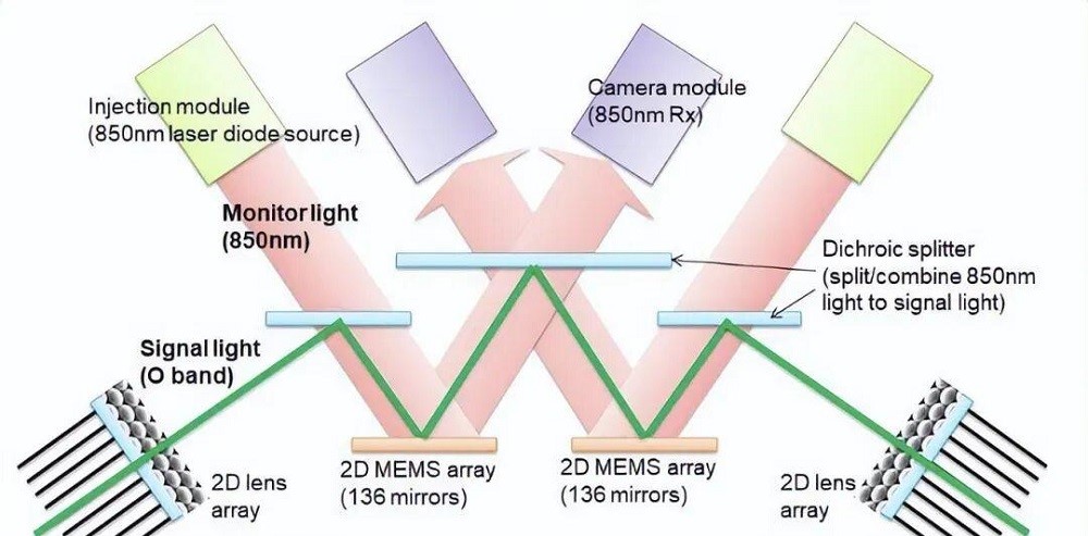 在这些技术路径中,MEMS(微机电系统)OCS是目前相对成熟的一类方案。该方案通过微型可动反射镜阵列改变光束传播方向,实现端口之间的光路重构。