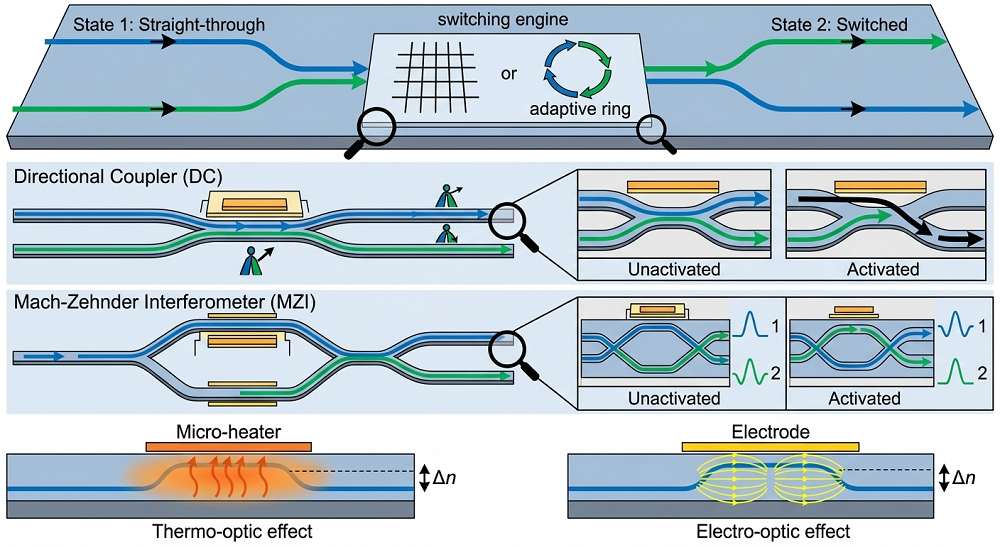 它更像是在铁路网络中部署了一套智能道岔系统。光列车无需进站停车,直接切换轨道方向,保持高速直通状态。虽然维持这个“道岔”系统的运行仍需要能量,但与O-E-O转换相比,其能耗降低了几个数量级,理论上能做到fj/bit(1000fj=1pj)量级。