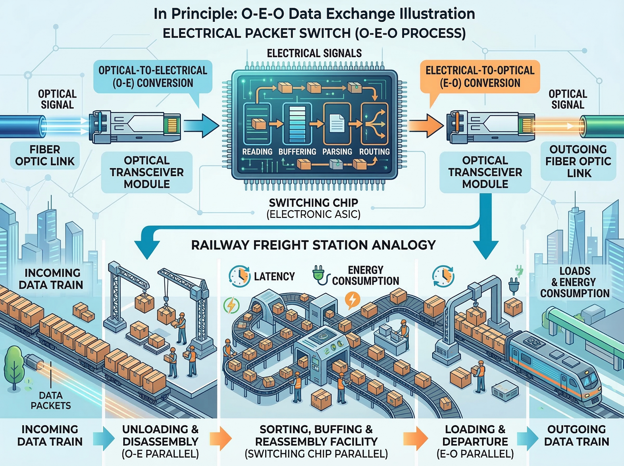 整个过程依赖“光-电-光”(O-E-O)的转换与电子交换芯片完成数据处理,光模块把光信号转换为电信号,由交换芯片完成读取、缓存与路由,再通过光模块重新转回光信号继续发送。