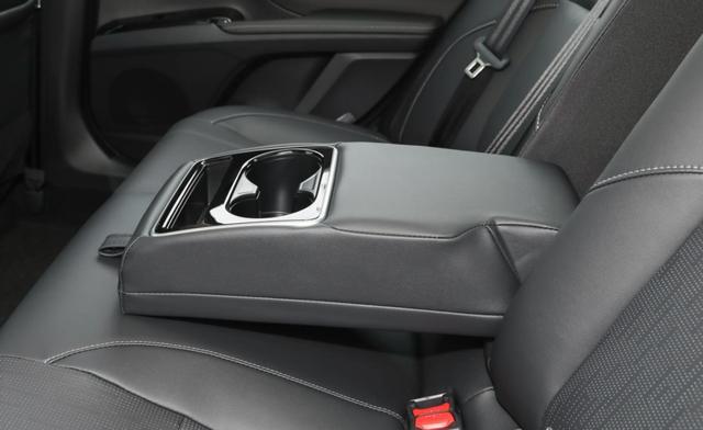 尊贵版座椅是真皮+仿皮材质,触感细腻,后排有中央扶手+杯架,杯架尺寸适中、扶手高度合理,家用实用性较高,前后排空调可分区控制,出风还算均匀,但风量调节按钮较小,操作略显不便。