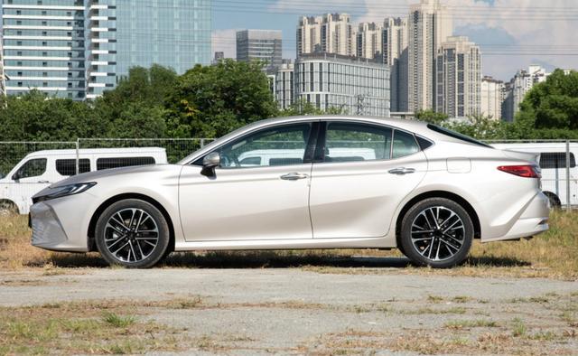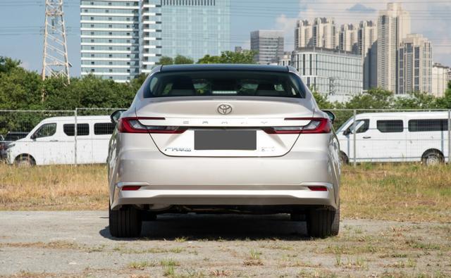 凯美瑞双擎尊贵版的车身线条流畅利落,车身侧面没有多余的修饰,也没有夸张的设计,整体造型修长舒展,搭配17英寸铝合金多辐轮毂,营造出一种沉稳内敛,低调绅士的氛围。车尾设计简洁耐看,窄长的C字形尾灯与车头相呼应,搭配红色装饰条和上方的英文标识,增强了整车的辨识度。