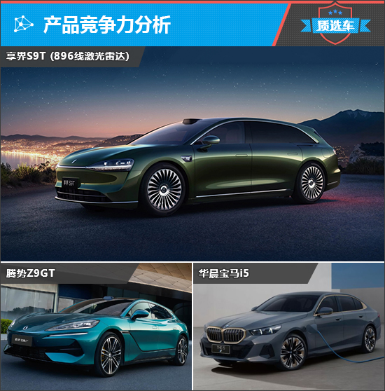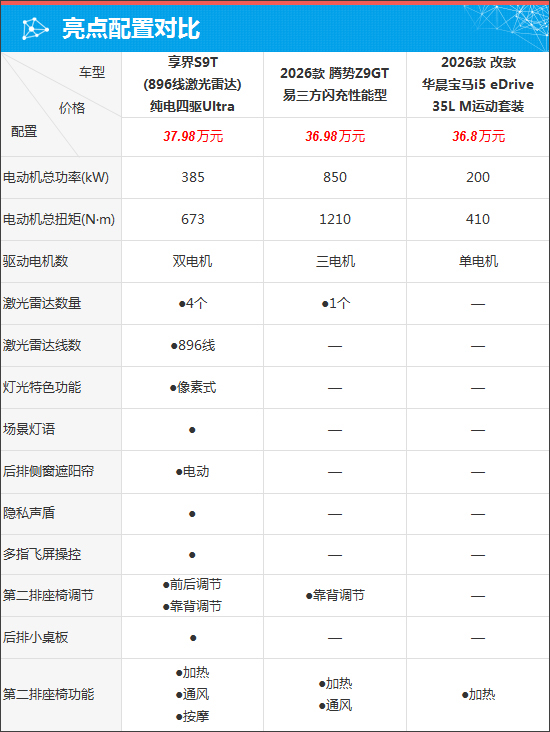 此次与享界S9T(896线激光雷达)(下文简称:享界S9T)对比的车型分别为2026款腾势Z9GT(下文简称:腾势Z9GT)和2026款改款华晨宝马i5(下文简称:宝马i5)。三款车型中,腾势Z9GT的车身长度和轴距领先,享界S9T车身宽度占优,而车身高度则是宝马i5更胜一筹。
