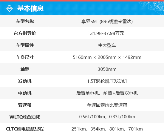 享界S9T(896线激光雷达)共推出4款车型,官方指导价31.98-37.98万元。新车提供纯电和增程两种动力,CLTC纯电续航里程根据车型配置不同,前者为701km和801km,后者为251km和354km。