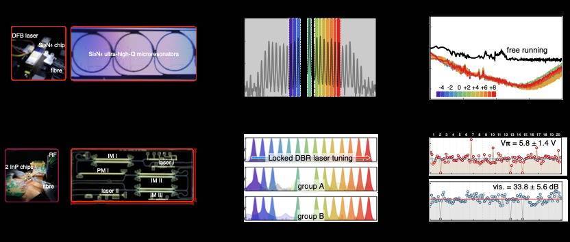 图2 集成光量子芯片关键性能表征。a,服务器端氮化硅微腔光频梳种子激光光源芯片。b,暗脉冲光频梳光谱。c,光频梳各梳齿的频率噪声功率谱密度。d,全集成的磷化铟QKD用户发送端芯片。e,用户端本地片上激光器的波长调谐范围。f,用户端片上调制器半波电压与调制深度。