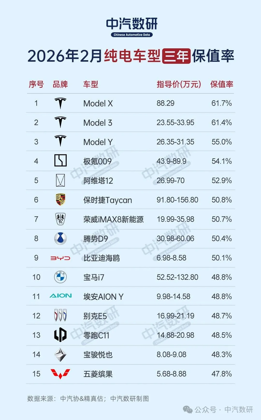 根据中汽数研发布的数据,在2026年2月一年车龄纯电动车型保值率榜单中,问界M9以82.1%的保值率领先,紧随其后的是极氪009(81.6%)和理想MEGA(80.8%),这三款定位高端的车型形成了保值率的第一梯队。Model Y和Model 3分别以79%和78%的保值率分列四、五位;小米SU7保值率76%排名第7位。