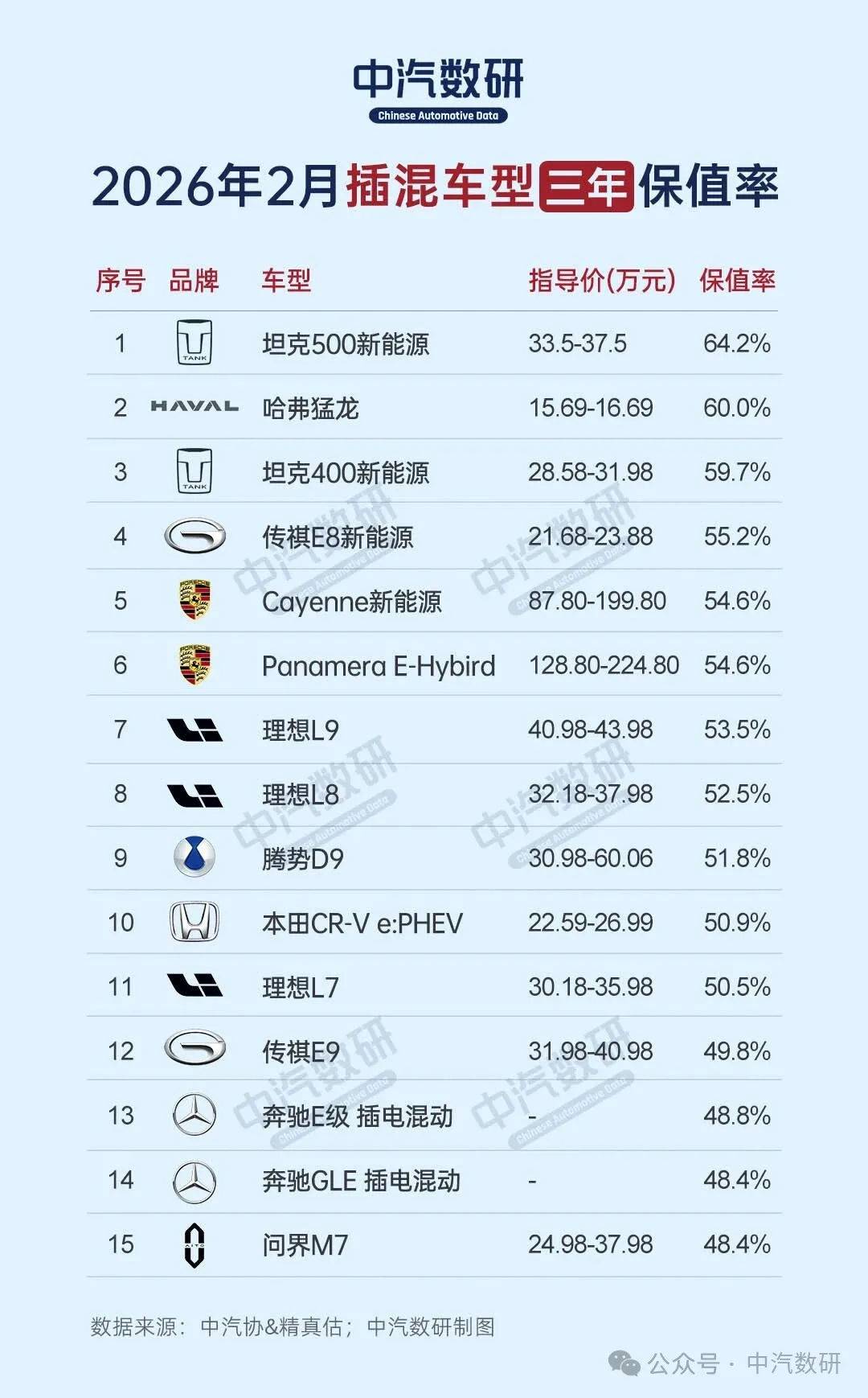 插混车型的三年保值率冠军则由坦克500新能源以64.2%夺得,哈弗猛龙以60%位居第二,坦克400新能源保值率59.7%排名第三。插混车型的三年保值率前十里面,国产车型占据了7席。