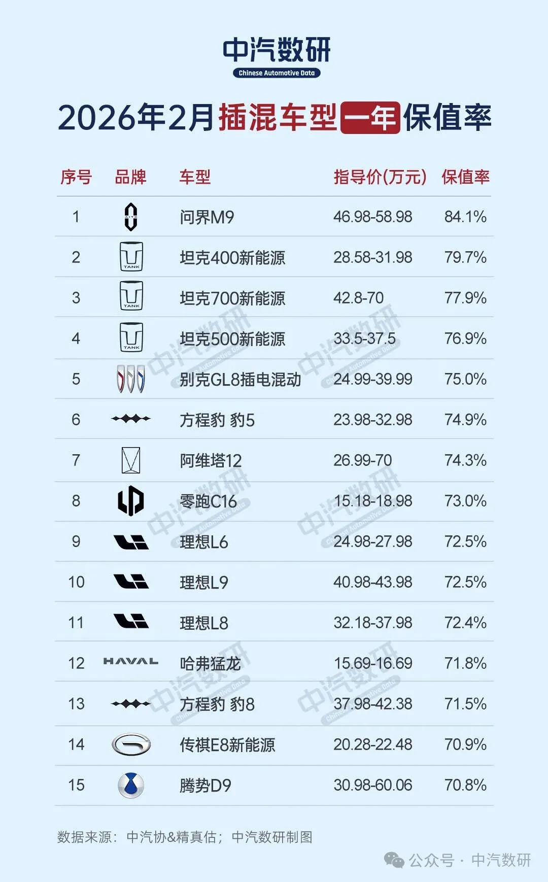而在插电混动车型的一年车龄榜单中,问界M9同样以84.1%的保值率位列第一,坦克400新能源(79.7%)、坦克700新能源(77.9%)和坦克500新能源(76.9%)分列二、三、四位。