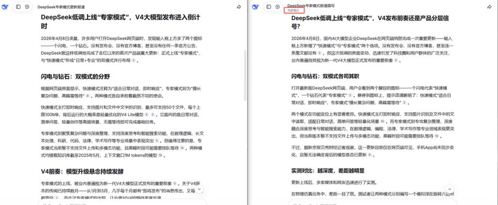 4 月 8 日,深度求索(DeepSeek)在产品端上线了“专家模式”,与原有的“快速模式”并列。更新后,用户在网页输入框上方能看到两个图标:闪电代表“快速模式”,钻石则对应“专家模式”,两者定位截然不同。