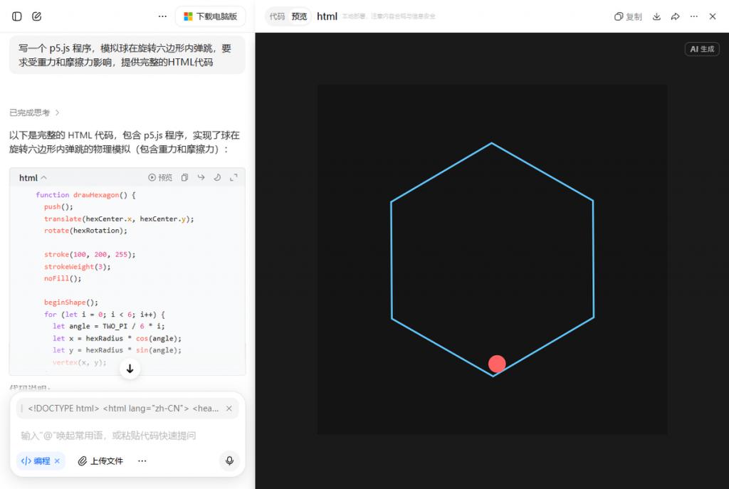 同样的实测,用豆包编写的模拟球在旋转六边形内弹跳的 p5.js 程序,效果及界面内容较为简单。